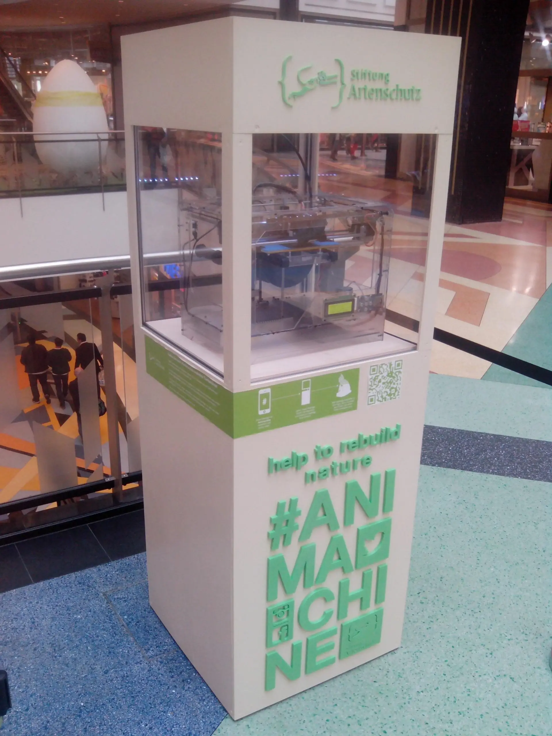 Animachine Installation - Participative Digital Fabrication for Endangered Species Conservation. Printing in Alexa Shopping Centre, Berlin.